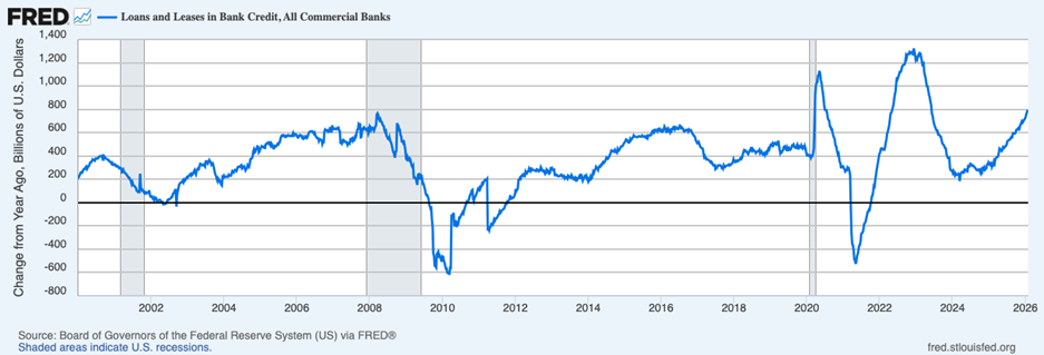 What’s interesting is that the opposite has not necessarily been true over the past few years. Even when the yield curve was inverted for the past two-plus years, bank lending didn’t stall. Total loan growth began in 2025 running at roughly a 2.7% year-over-year pace. By late November, it had accelerated to about 5.4% year over year. That is a meaningful improvement, especially considering rates were largely unchanged for much of the year and liquidity conditions were, by conventional standards, tightening rather than easing. As seen on the chart below, showing the year-over-year change in loans and leases in bank credit (in billions of U.S. dollars), credit has been flowing solidly since 2022.